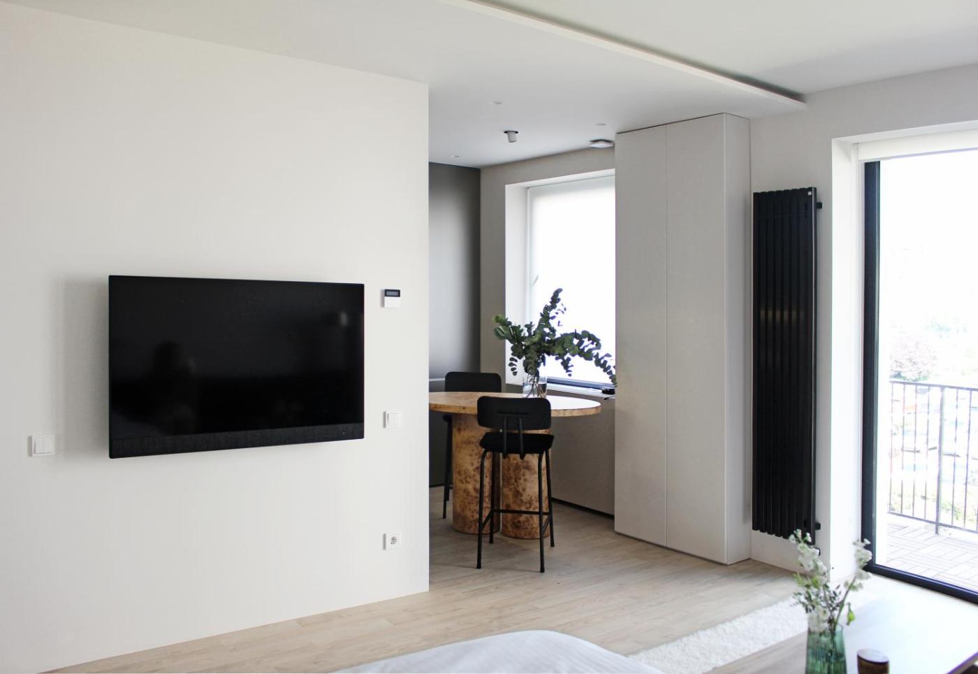 One-Bedroom Apartment. Boasting a private entrance, this air-conditioned apartment comes with 1 living room, 1 separate bedroom and 1 bathroom with a walk-in shower and a hairdryer. Guests can make meals in the kitchen that features a stovetop, a refrigerator, kitchenware and an oven. Featuring a balcony with city views, this apartment also features a washing machine and a flat-screen TV with streaming services. The unit has 1 bed.